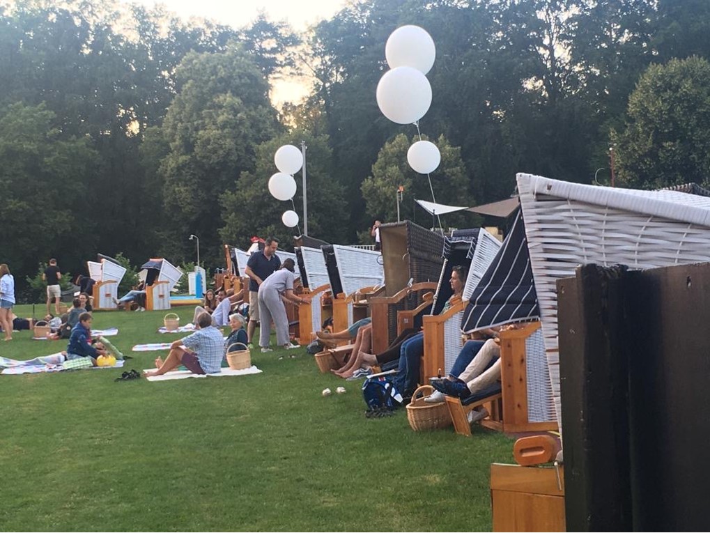 Pünktlich um 21 Uhr startete «Indiana Jones and the Last Crusade» (1989), der dritte Film von Steven Spielbergs «Indiana Jones»-Tetralogie. Zuletzt gesehen? …eben damals im Kino. Und immer noch fasziniert, wie innovativ der Einsatz der visuellen Effekte und der Tontechnik für diese Zeit war. Ansonsten war dieser Abenteuerfilm in erster Linie witzig und wartete mit viel «James Bond»-Action auf. Wir lagen gemütlich auf der riesigen Picknickdecke (gesponsert von Tschibo), die wir auch behalten durften, und hatten freie Sicht auf die Leinwand. Mit gut 60 Personen teilten wir uns die riesige Wiese; die restlichen 20 Personen bevorzugten die Strandkörbe.